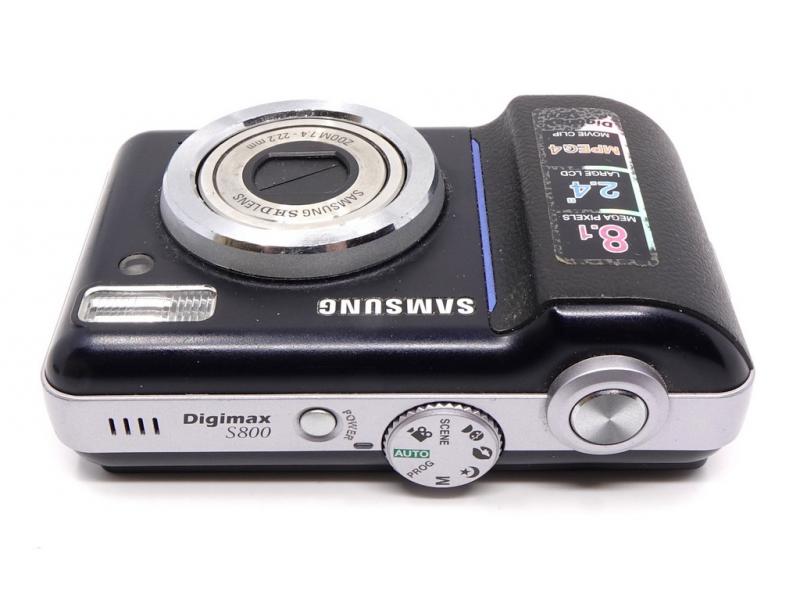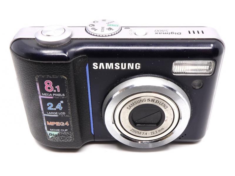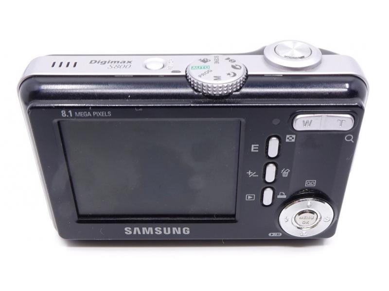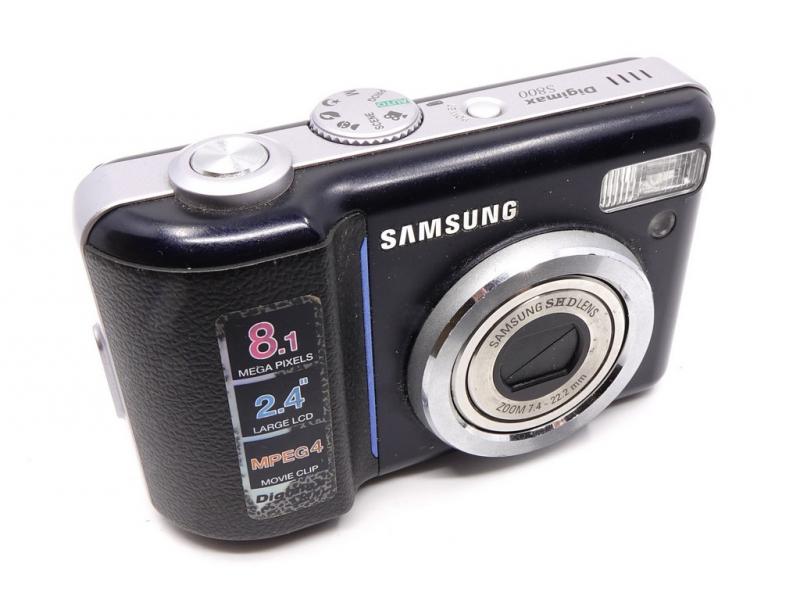 Kompaktowy aparat cyfrowy Samsung S800 w eleganckim czarnym kolorze.